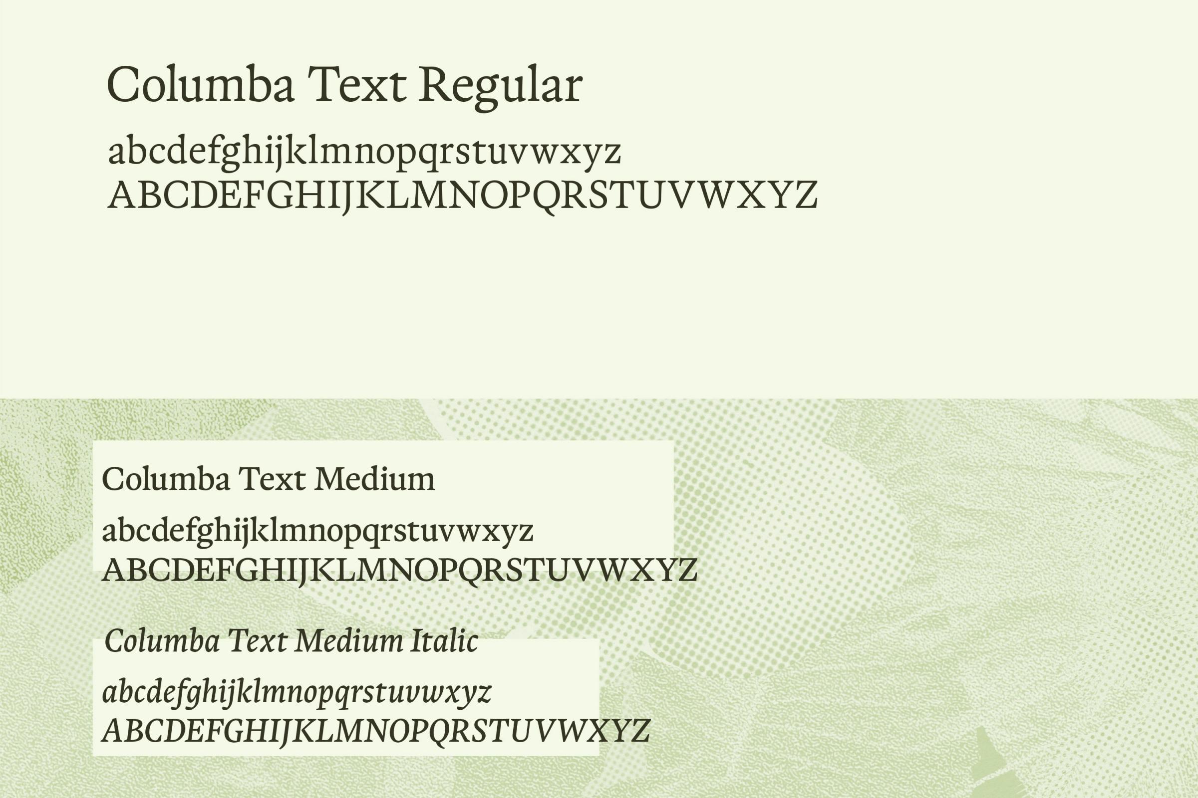 The typeface“Columba Text” is a well-legible and characteristic part of the branding.