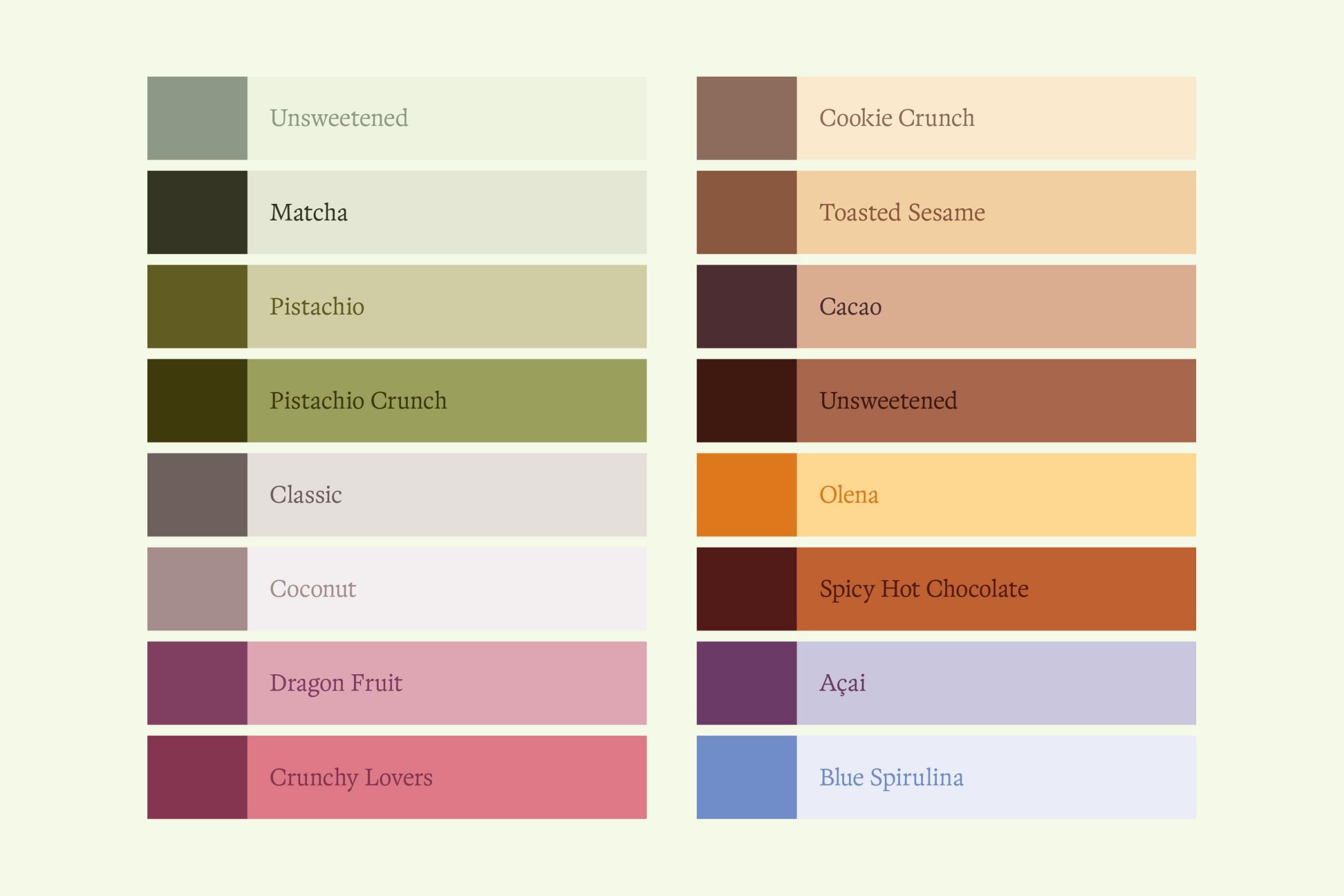 ← Each flavor is expressed with a different color combination referencing the respective ingredients.