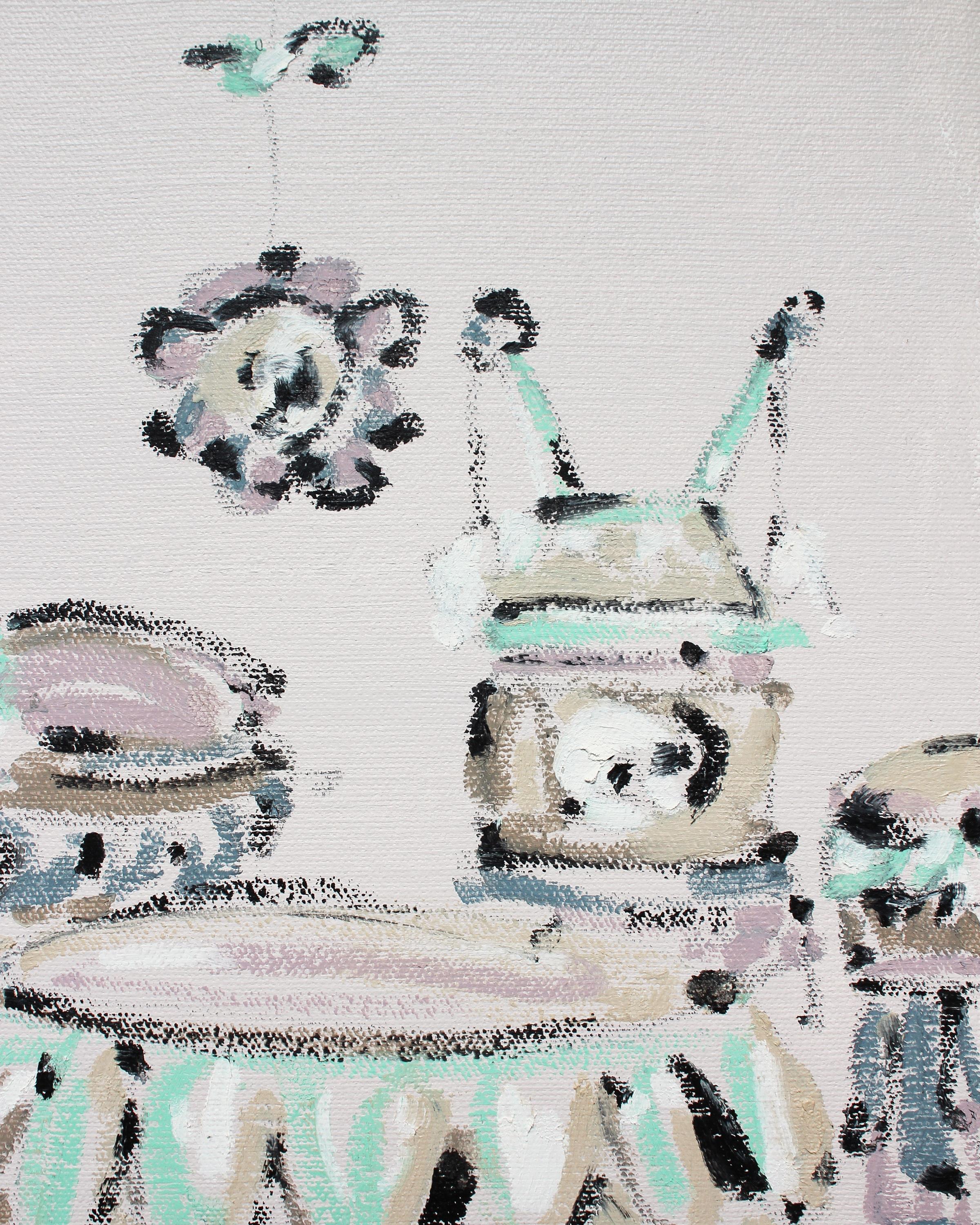 „Eine Uhr, zwei Karussells, ein Mobile, zwei Trommeln und vier Kreisel“ – oil, acrylic and graphite on canvas, 12x16 inches →